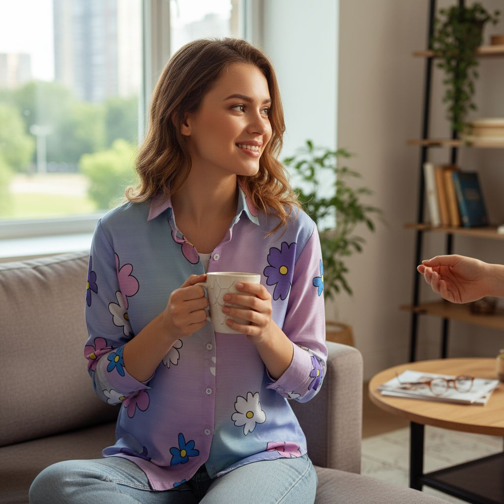 The Bloom Bae Shirt celebrates color and individuality with its multi-shade base and vibrant floral prints. Tailored in lightweight 4-season Moroccan Whisper Cotton, it feels airy, soft, and perfect for every season.